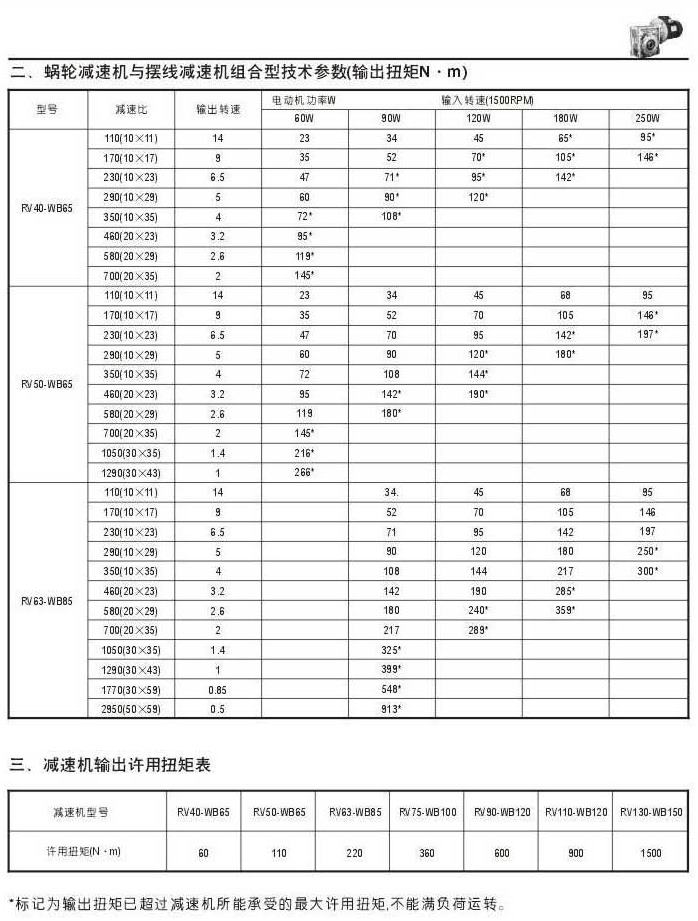 蝸輪減速機與WB系列擺線減速機組合型技術參數表(輸出扭矩N.M)一減速機輸出許用扭矩表